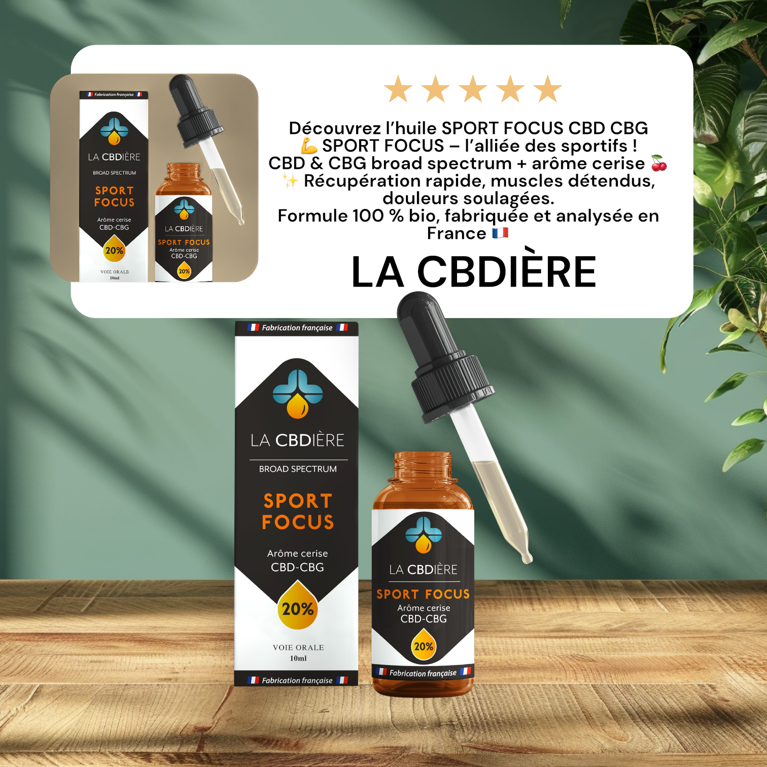 💪 SPORT FOCUS – Huile CBD CBG à la cerise par LA CBDIÈRE: l’huile CBD idéale pour la récupération musculaire après le sport.