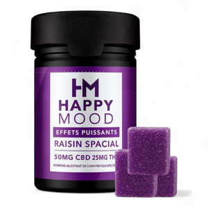 👉 Les Gummies HAPPY MOOD – Raisin – 50mg CBD + 25mg THC sont idéals pour ceux qui recherchent une expérience puissante et premium.
